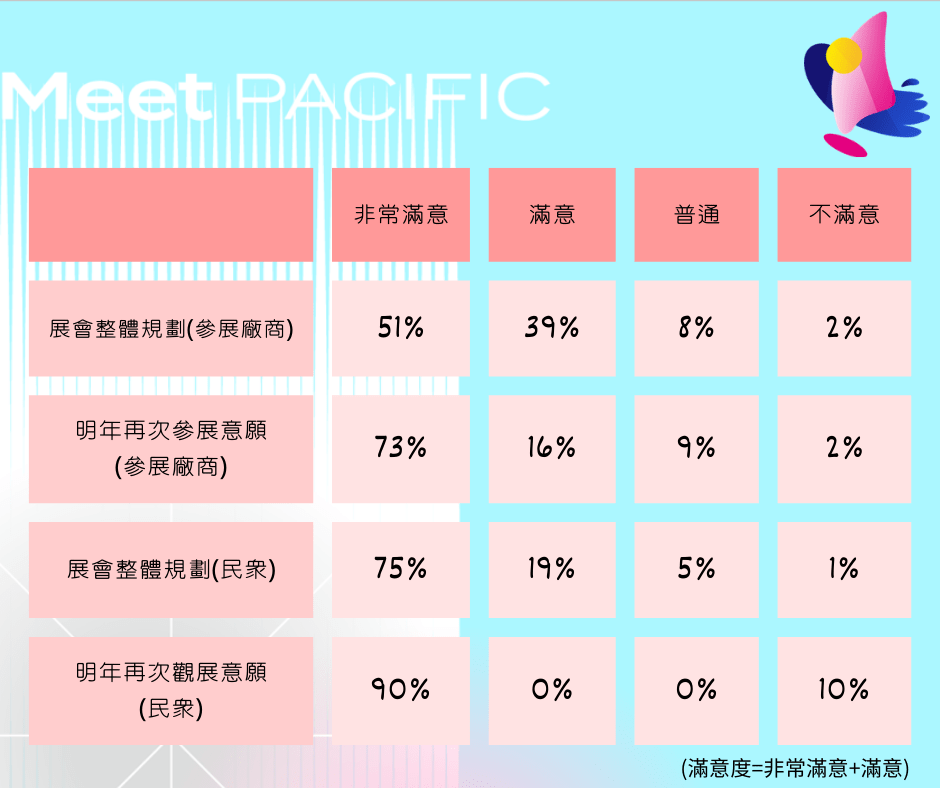 參展廠商滿意度回饋,九成團隊對展會整體規劃感到滿意,且近八成團隊表示明年有意願再次參展,期盼透過展會平台增加品牌曝光、尋找潛在客戶及新的業務合作機會等。觀展民眾回饋滿意度九成五,並有九成民眾表示明年想再參加展會。展會吸引觀展民眾駐足停留且印象深刻的前三名為風格手創展區及永續ESG、美好生活產業主題展區,另深受民眾喜愛的展會企劃排序前三分別為草地音樂會、青創主題館及全球創業趨勢論壇。