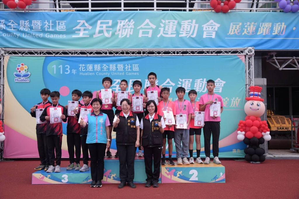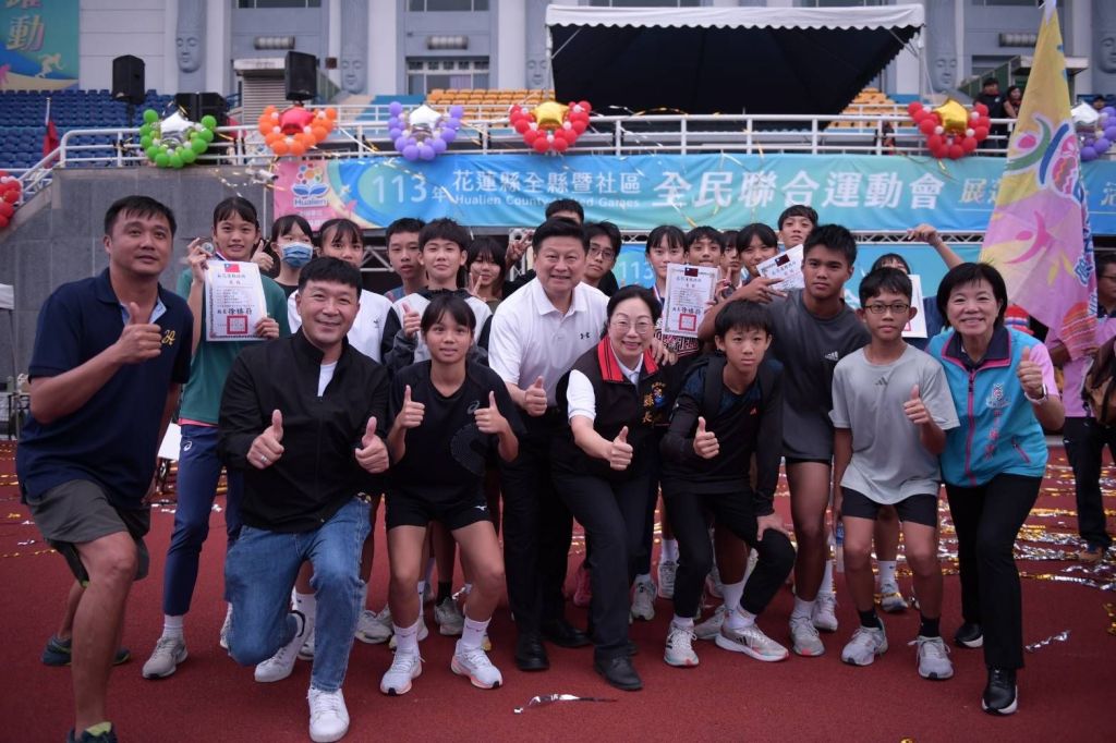 「113年花蓮縣全縣暨社區全民聯合運動會」今(17)日下午於縣立田徑場舉行閉幕典禮,大會主席縣長徐榛蔚偕同立法委員傅崐萁、縣府教育處代理處長翁書敏、吉安鄉長游淑貞等與會貴賓,共同祝賀本次在各賽事組別獲得亮眼成績的單位,選手們平日堅持不懈的勤練付出在各項運動賽事中盡情展現,極盡所能超越自我的精神令人感動,也感謝所有機關的熱情參與及默默耕耘的指導老師及教練們,為了花蓮的子弟不斷地努力堅持,讓花蓮體育大縣的美名發光發亮。