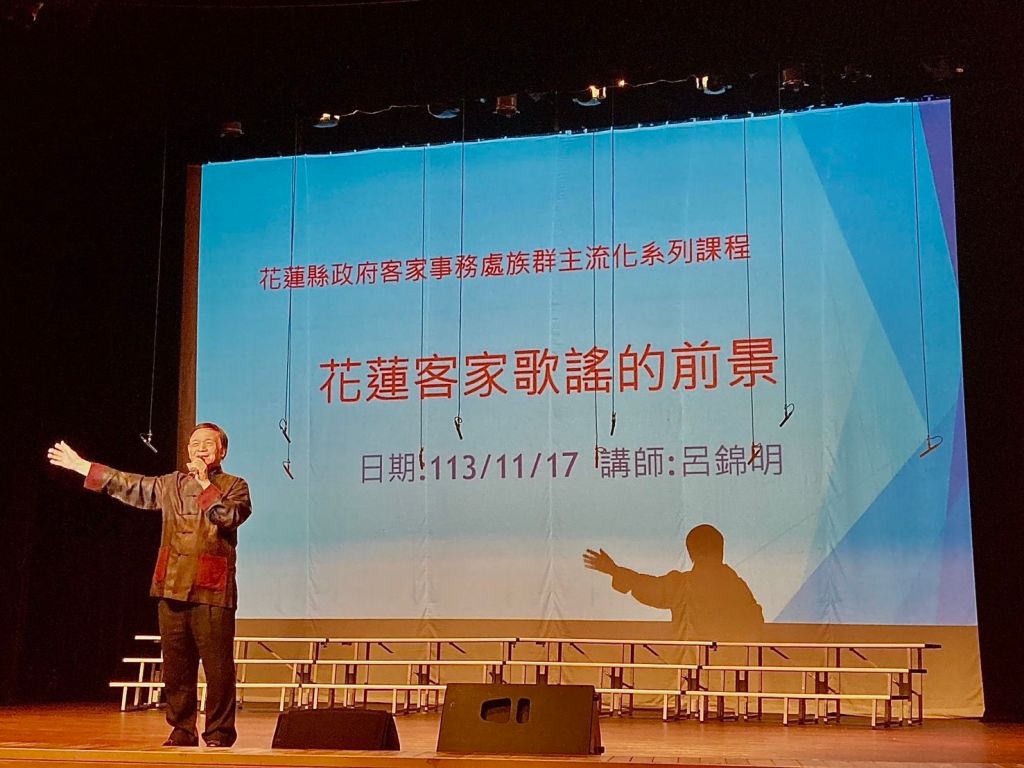 花蓮縣政府於11月16日及17日辦理的「客家發展計畫」族群主流化課程已於玉里鎮藝文中心及花蓮縣客家文化會館演藝堂順利完成!課程分別由姜雲玉老師及呂錦明老師主講,課程主題分別為「台灣客家山歌的未來發展」及「花蓮客家歌謠的前景」,兩位老師分享了自身豐富的經驗與想法及客家歌謠相關的技巧和知識,且現場進行示範演唱,珍貴的課程內容分享,讓鄉親們獲益良多。課程之後接著台灣客家山歌團「歌中遊.遊花蓮」歌舞劇表演,表演曲目中特意安排了許多與花蓮相關的曲目,有《阿姆个背帶》、《懷念箭瑛先生》、《歡迎來玉里》、《縱谷平原開花展》及《歸鄉个路》等,讓前來聆賞的鄉親們深感共鳴。