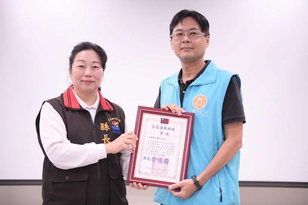 市長魏嘉彥表示,花蓮位處地震帶,又東面太平洋,面臨天然災害風險,防災未雨綢繆公所團隊責無旁貸,花蓮市曾面對多次重大地震和颱風挑戰,公所同仁向來也展現專業的災防應變能力,以民眾安全為核心,確保災時能迅速採取行動,減少人命財產損失,因此要特別感謝縣政府的表揚肯定,也希望將這份榮耀與同仁們共享。