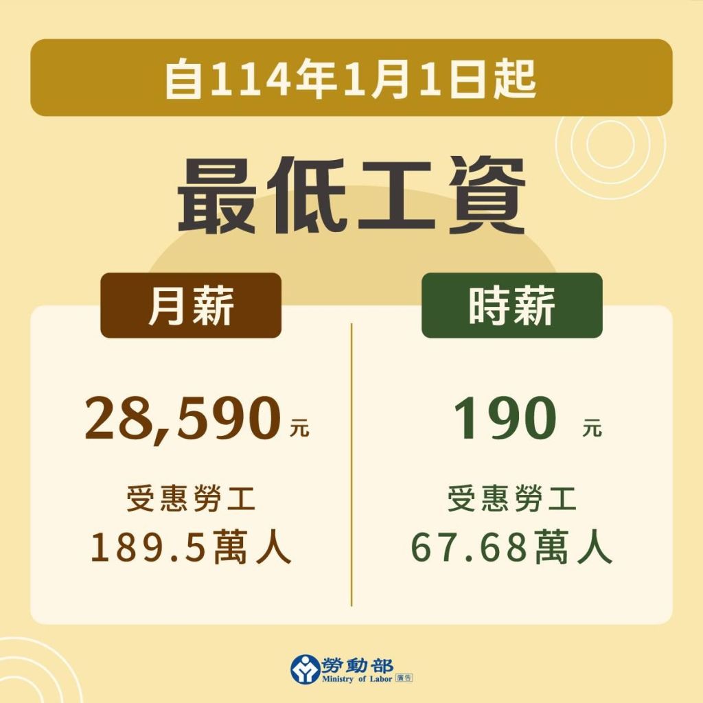 依據勞動部公告,自114年1月1日起,最低工資將調漲為月薪新臺幣(下同)28,590元,時薪為每小時190元。此次調整是依據當前經濟狀況、物價變動及勞工生活成本等因素,旨在提高勞工的生活水準,促進社會經濟的穩定發展,對於相關勞工保險及勞工退休金提繳亦有連動影響。