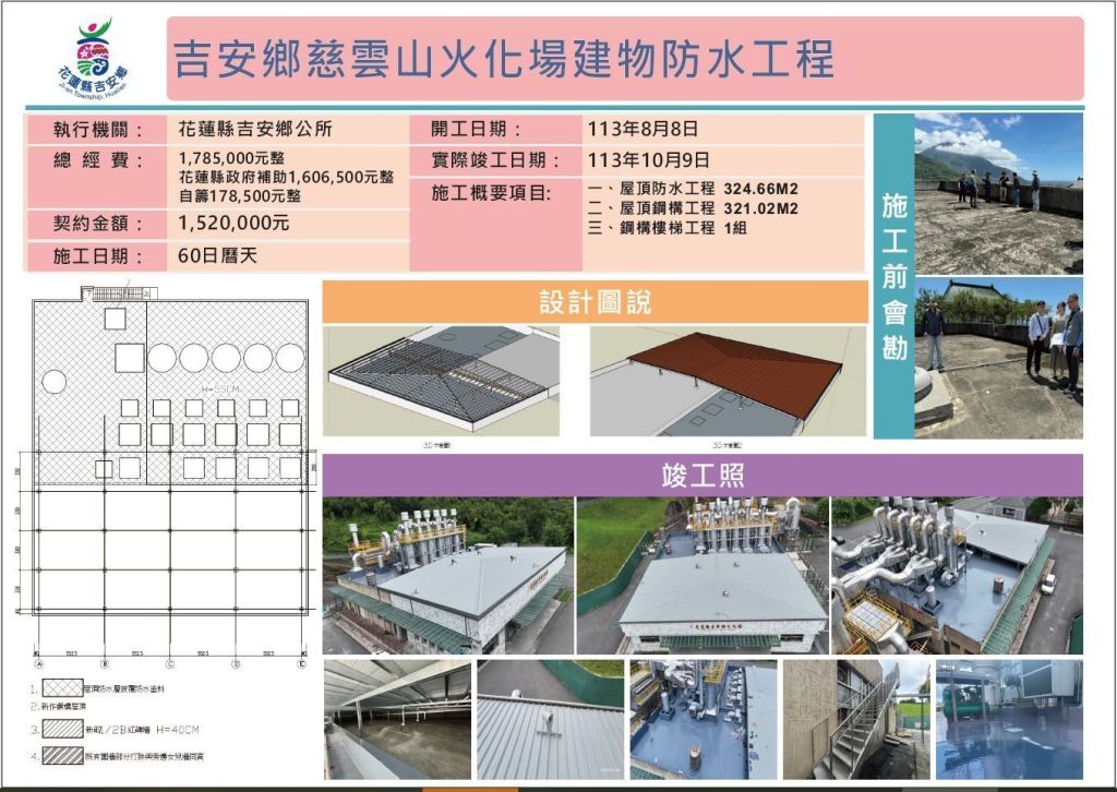 游淑貞指出,火化場位處山區氣候潮濕多雨,建物屋頂開始出現多處滲水及設備老化問題,長期濕氣導致壁癌將影響火化設備的使用壽命,因此鄉公所提出防水改善與設備更新計畫,獲縣府防水工程160萬6500元補助、機電設備改善工程478萬3500元補助,合計為639萬,在吉安鄉團隊積極效能行動執行下,兩項計畫工程均已順利完工。
