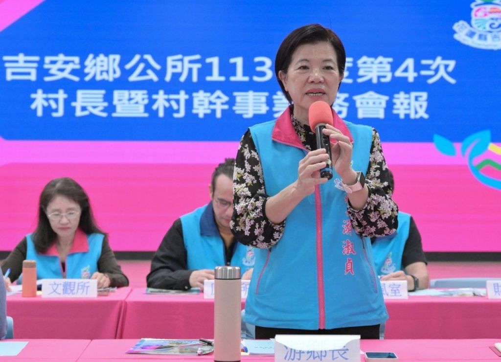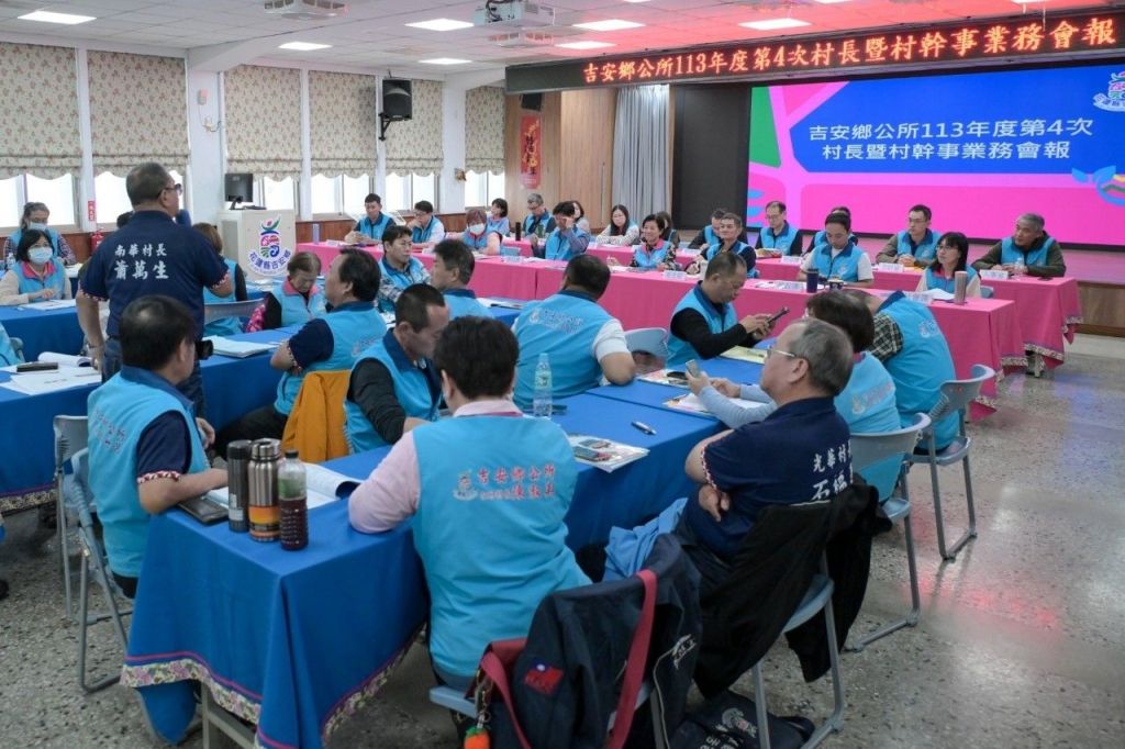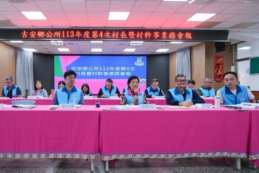 吉安鄉公所攜手十八村長推動基礎建設與社會服務措施,持續深化基層服務,日前召開113年度第四次村長暨村幹事業務會報,鄉長游淑貞親主持並偕同各課室所主管出席,除針對過去執行鄉政成果及瓶頸提案進行討論外,盼藉村鄰長與村幹事服務網絡,將最新資訊傳遞鄉親知悉並落實服務於地方基層。