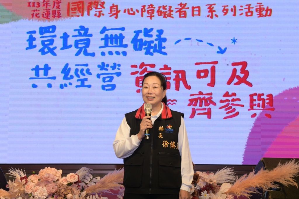 「每個人的力量都足以發揮幸福的推動!」縣長徐榛蔚表示,這場典禮不僅是對傑出人員的表彰,更是對所有為身心障礙者付出的工作者表達敬意。她舉了《一曲搖滾上月球》及《台灣超人》兩部電影例子詮釋了即使人生的道路遇到困難,但只要努力與樂觀,都可以成功,也透過這些真實的故事與成就,讓更多人關注身心障礙者的需求、讓身心障礙者能自在、自立的在社區中生活,是花蓮縣政府持續長期努力的目標,各局處積極分工協力,透過無障礙交通運輸、改善公共空間無障礙環境、友善職場、普及醫療照護,以及提供輔具服務、社區式整合照顧服務、手語翻譯服務等多元支持性社會福利服務,給予身心障礙者更多支持、保障各項生活權益。