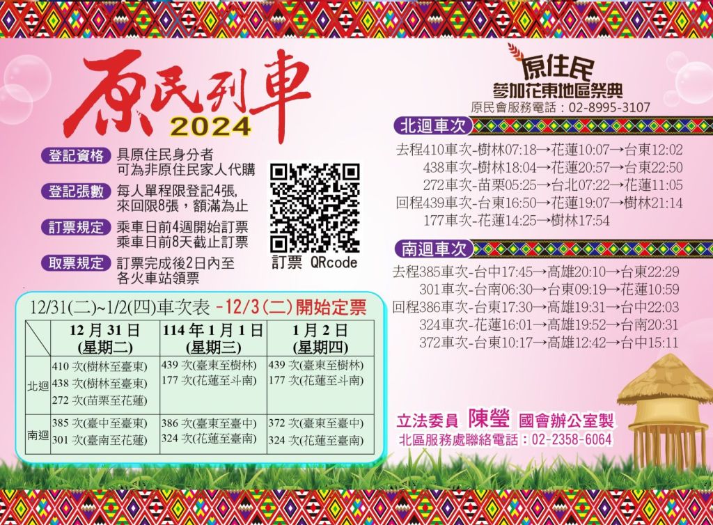 由立法委員陳瑩催生的「原民列車」,每年春假、七八月及年底,都會開設專為原住民設計的返鄉列車,2024年底的返鄉列車,今晚0時(3)日起「開始訂票」囉!陳瑩呼籲「有需要的族人,可以多多利用哦!」