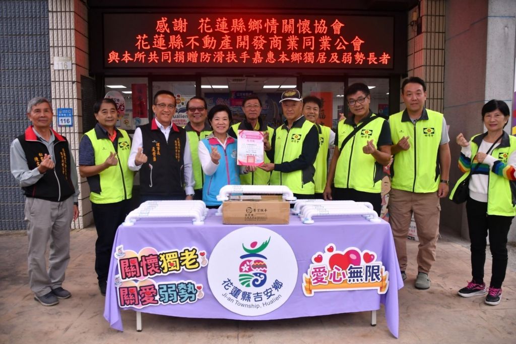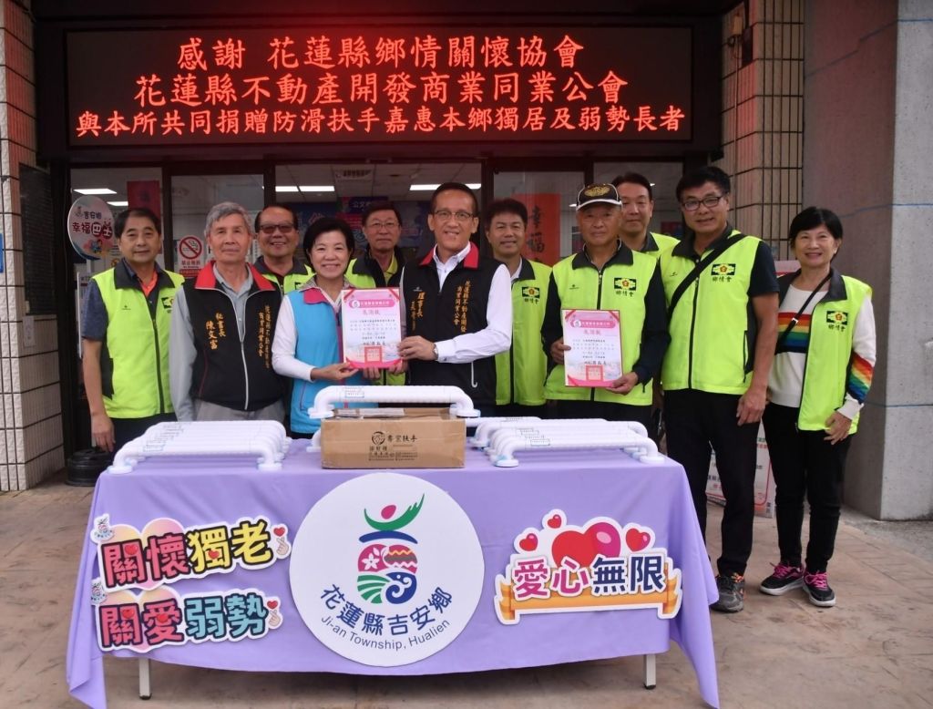 吉安鄉長游淑貞親領團隊致力推動社會福利友善措施,攜手民力與社會資源照服銀髮長者,促進在地安養樂活廣獲好評;用心啟動鄉公所關懷防護網,邀約花蓮縣鄉情關懷協會、花蓮縣不動產開發商業同業公會共力推動居家安全改善服務,提供鄉內獨居長者、列冊65歲以上長者關懷戶及65歲以上低收、中低收、中低老人家戶,共計100戶免費安裝浴室抗菌防滑扶手,於今(3)日在吉安鄉公所辦理捐贈儀式,鄉長游淑貞深表感謝兩社團長期協力關懷弱勢獨老,除代表致贈感謝狀外,同時關切具體安裝設備情形,以確保長者居家安全保障。
