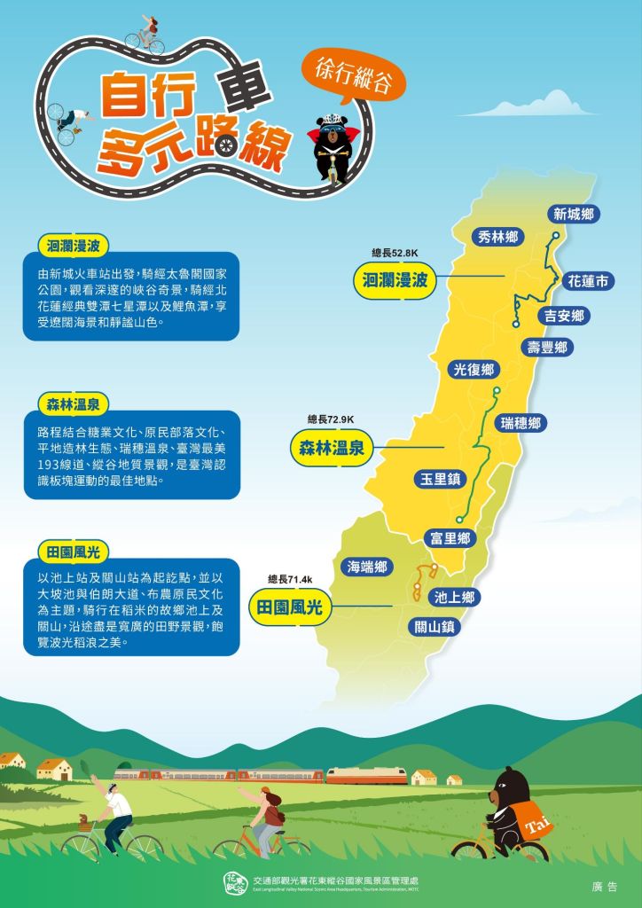 交通部觀光署花東縱谷國家風景區管理處(下稱縱管處)為推廣花東自行車旅遊文化,推出「徐行縱谷」自行車旅遊品牌,範圍涵蓋花蓮縣的新城、壽豐、鳳林、光復、瑞穗、玉里,以及台東的池上、關山、鹿野等地,徐行縱谷亦為花東縱谷觀光圈五大品牌之一,透過整合縱管處轄內三條自行車多元路線,並藉由在地特色、生態旅遊、綠色旅遊及跨域合作,為旅客展現花東縱谷的自然風光、專用自行車道、純樸社區及原鄉部落的熱情文化,提供豐富且具深度的旅遊體驗,各主題路線的簡介如下: