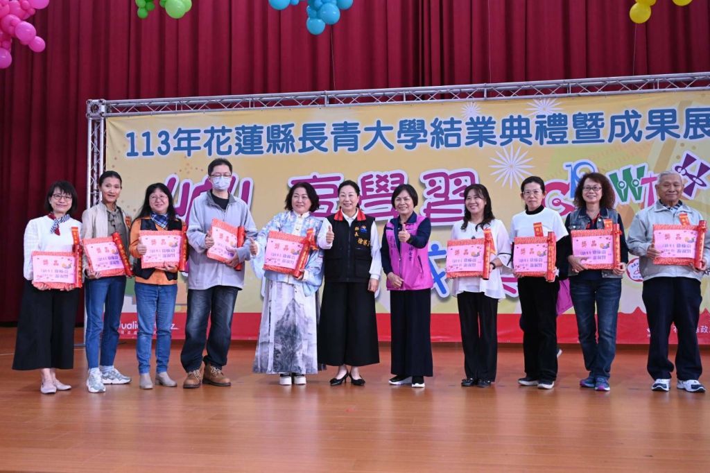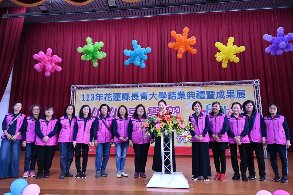 花蓮市婦女會長青大學今(6)日於花崗山中正體育館舉行「樂享學習‧趣秀成果〜113年長青大學結業暨成果展」活動,縣長徐榛蔚及多位貴賓皆到場一同慶祝結業,並歡喜見證群銀髮族同學展現豐碩學習成果,更鼓勵花蓮縣鄉親們要活到老學到老。