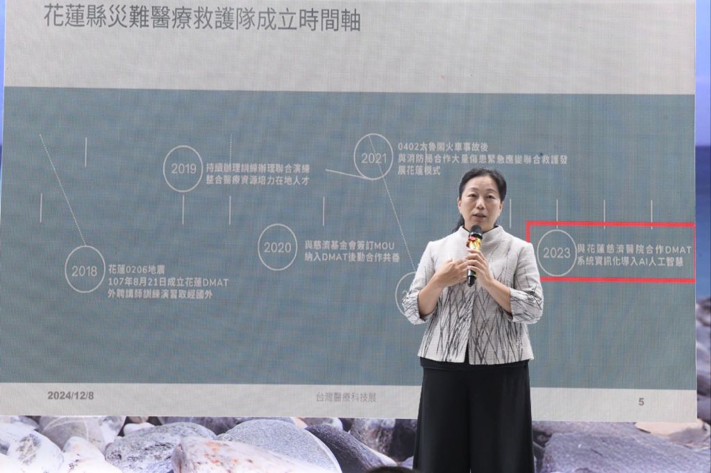 「花蓮是全台首創升級iDMAT的縣市!」,縣長徐榛蔚表示,在前縣長傅崐萁的遠見下,花蓮縣政府與慈濟團隊攜手,0206地震後率先成立DMAT團隊,在台鐵太魯閣事件中首度投入,在重大意外災害發生時進入現場指揮調度,讓第一線的警消與醫療人員能盡速搶救傷患,但因為現場常天候不佳,傷者人數眾多,手寫醫檢紀錄也讓醫院與家屬無法及時辨認,造成醫療與調度上的困難。