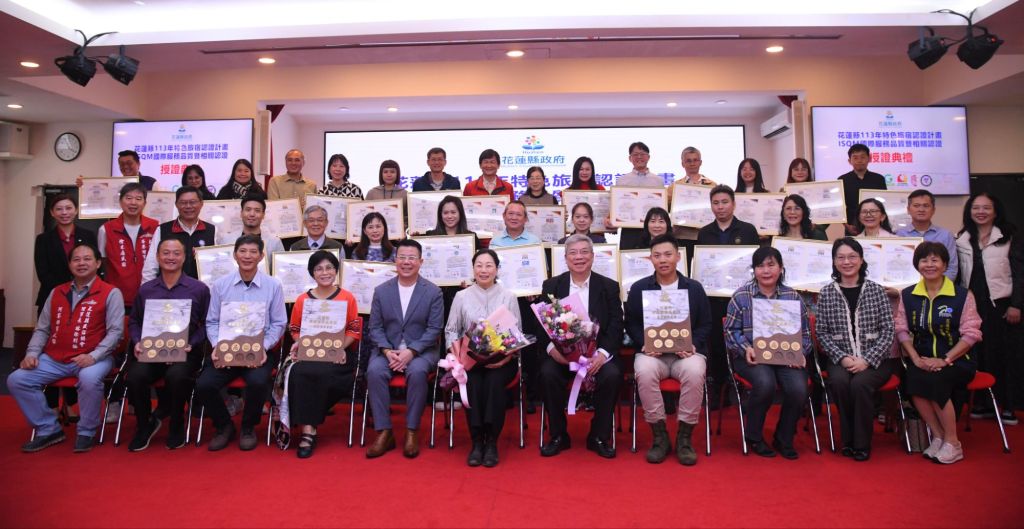 花蓮縣政府今(13)日在縣府大禮堂舉行「113年度優質友善旅宿認證計畫」頒證儀式,由徐榛蔚縣長與法約爾國際認證機構董事長王孝慈及多位貴賓共同授證。此計畫吸引70多家業者報名,經過嚴格選拔及培訓,最終有26家業者獲得認證,包括瑞穗天合國際觀光酒店、台糖花蓮旅館、虎爺溫泉會館等共計取得67張證書。