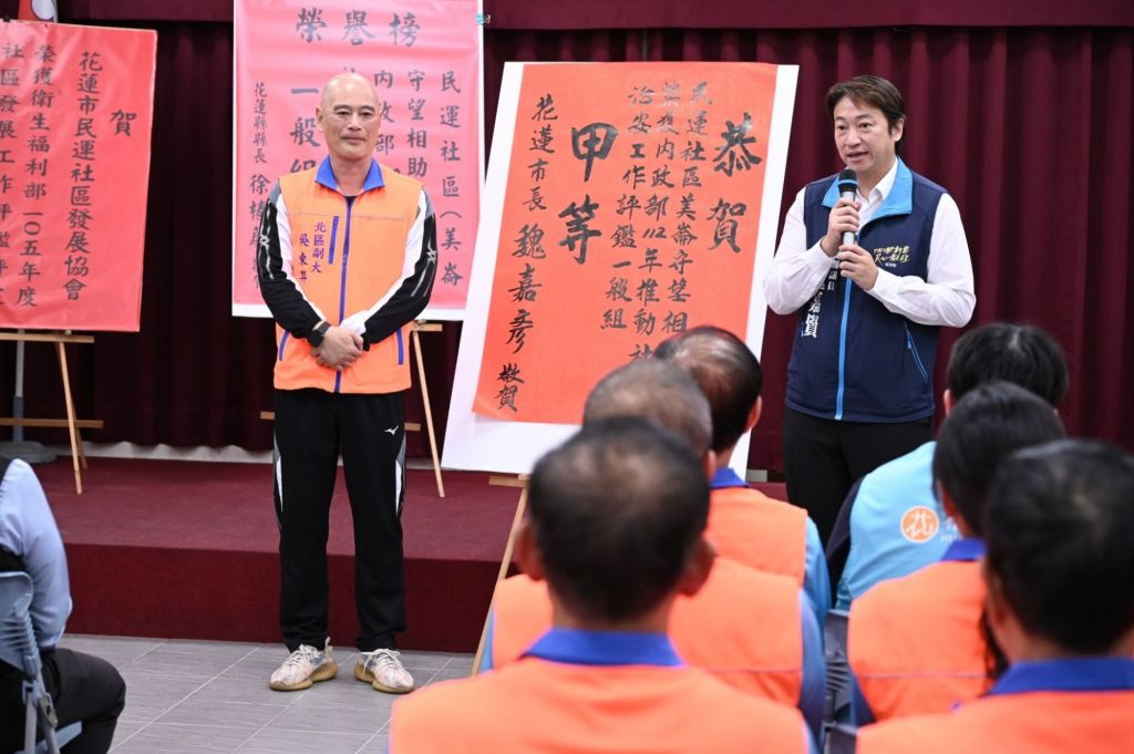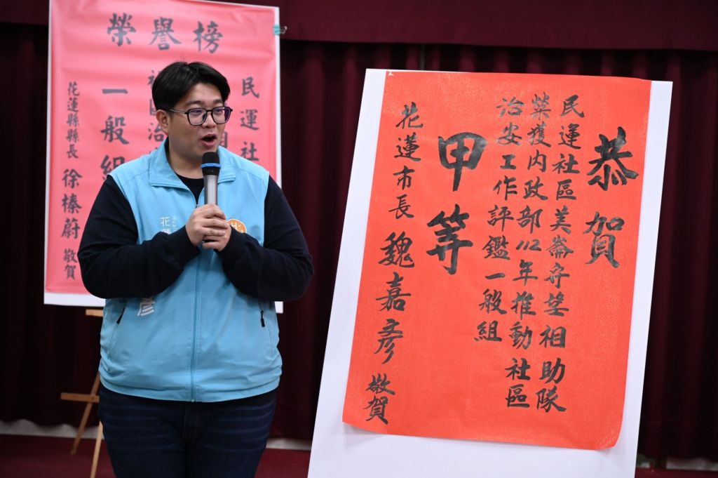 花蓮縣美崙守望相助隊(花蓮市民運社區) 獲得內政部肯定,今113年榮獲績優社區一般組甲等的佳績,市長魏嘉彥日前前往胋紅榜並頒發獎勵,由民運里長暨巡守隊分隊長林美靜代表受獎。魏嘉彥表示,感謝守望相助隊長期以來對花蓮市治安的付出與奉獻,堅守岡位守護社區及人民生命財產安全。