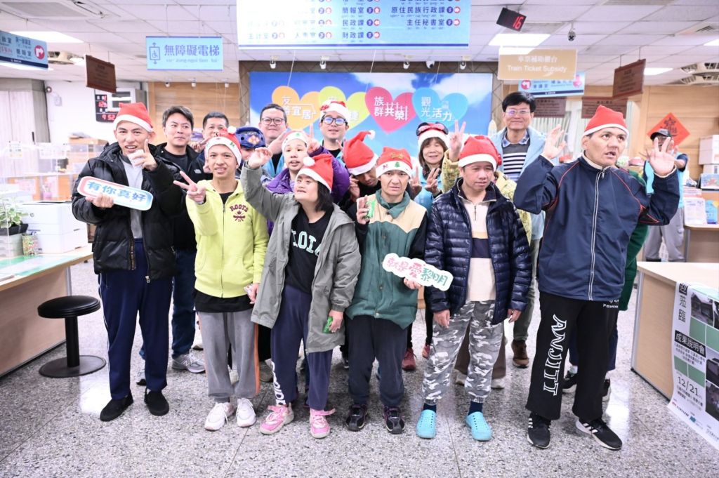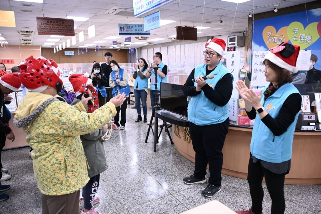 由黎明教養院生以應景的耶誕歌聲為大家報佳音,院生們邊唱邊跳,即使跟不上節拍,臉上也始終都掛著大大的笑容,讓現場所有人感受到他們所帶來的歡樂。魏市長、主任秘書翁美華與市公所主管、同仁在輕快的旋律中,以拍手打出節奏為院生的表演加油打氣,感受耶誕節氣氛。
