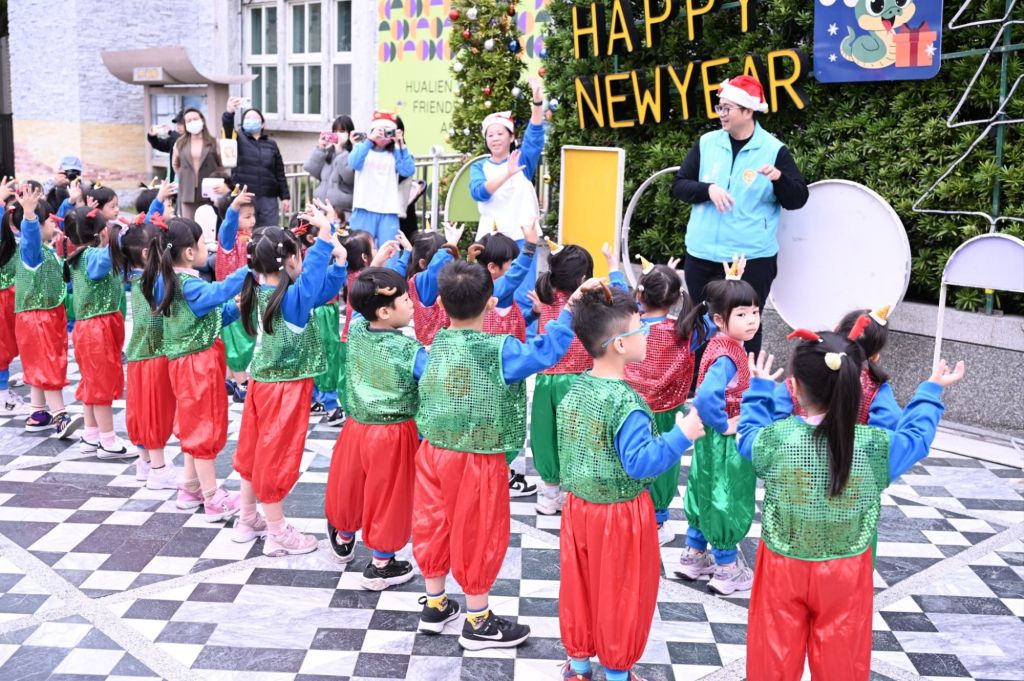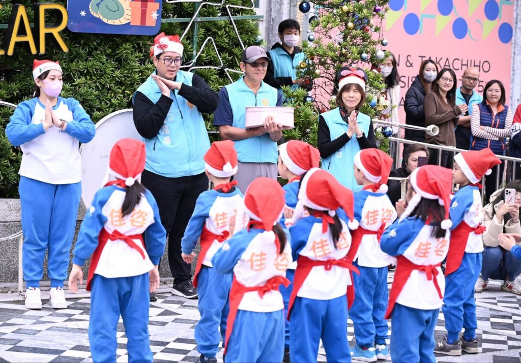 緊接著佳姿幼兒園大中小班的孩子們,身穿應景的聖誕服飾到市公所前廣場,60多位小小聖誕老公公唱唱跳跳,超級咖哇伊,現場瀰漫著濃厚的節日氛圍,小朋友們將歡樂與純真的祝福送到每個角落,讓市公所大廳化身為聖誕小樂園。 天使幼兒園的130位小朋友穿上充氣衣,變身為胖胖聖誕老公公,他們帶來一連串聖誕組曲,搭配活潑可愛的舞蹈,每一位小朋友唱起歌、跳起舞來活力十足,小朋友也不忘給市長及公所的同仁一個愛的大抱抱,氣氛歡樂又溫馨。