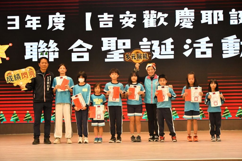 鄉公所也藉千人歡欣活動來表揚語文競賽及縣運優異成績同學與選手,鄉長游淑貞親自為學童頒贈獎金,讓得獎者倍感榮耀和自信心,也讓歡樂的節慶活動增添寓教於樂的教育性意義。 精彩節目中有清水教會與太魯閣族發展協會悠揚演唱的耶誕禮讚、斯達岸原舞隊跨越年齡層的親情合作表演、吉安鄉立幼兒園與明禮國小附幼的超萌娃娃演出;還有靚魅力勁辣中東耶誕舞團、國際運動舞協會大小國標耶誕、花漾亮麗舞團的手創聖誕服裝、舞動人生聖誕嘉年華、練舞功超魅力加油舞、健健美有氧發展協會耶誕健康舞、源自鳳林鎮前來的采虹蹈班、吧奇奇等專業且別具各創意特色的舞碼盡出,時而熱力四射、時而婉約柔美,盡情揮灑充滿生命力的舞姿多元豐富,為聖誕節的妝點特色…令人驚訝連連。