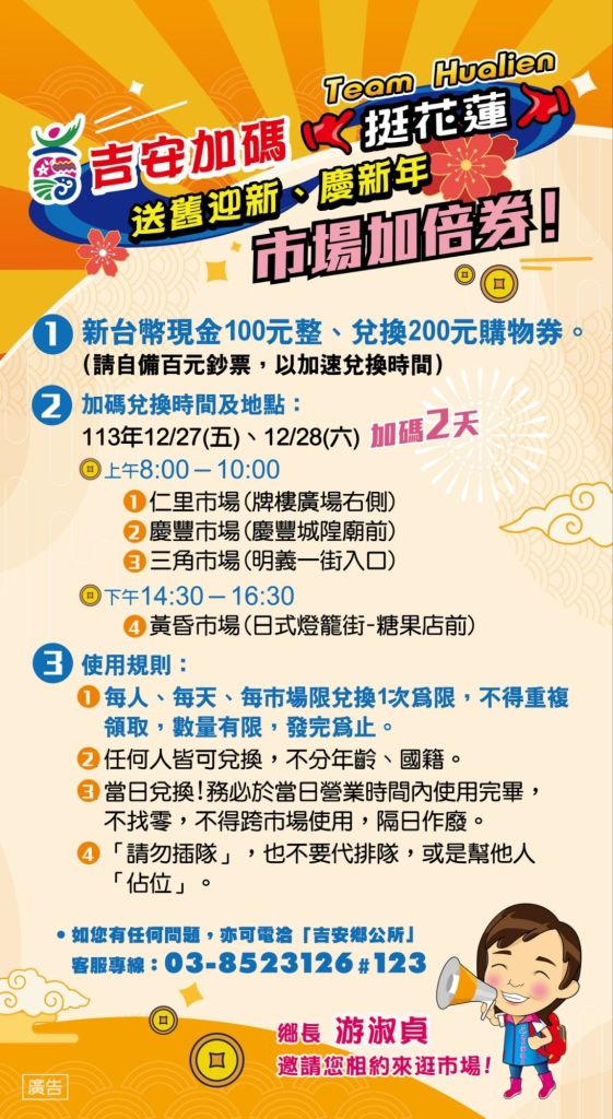 鄉長游淑貞表示,吉安鄉公所響應縣府市場加倍券優惠方案,更為屏除過去天災所造成的瓶頸障礙,於歲末最後一週用消費購買優惠迎接幸運新年,將一整年的圓滿加碼於12月27、28日(週五、週六)增額發送市場加倍券,當日上午8點至10點於仁里市場、慶豐市場、三角市場,當日下午2:30至4:30於黃昏市場,每人每天每個市場可兌換一次(全數發完為止),不分年齡、國籍皆可持一百元現鈔兌換二百元購物券,當日兌換限當日時間內於市場使用完畢。相關事宜可洽詢鄉公所電話:038523126轉分機123。