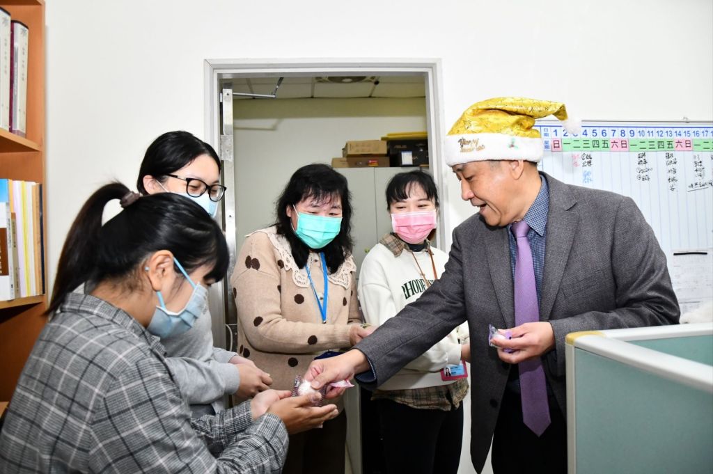 今25日聖誕節當天,簡以嘉院長及主管穿戴聖誕老人的帽子、服裝,手拿糖果袋,走進院本部病房、診間,為住院及門診病人還有同仁們,送上甜蜜的糖果和節日的祝福,伴隨著聖誕喜慶的音樂,將歡樂傳遞到醫院的每個角落。病人們在收到糖果的那一刻,臉上洋溢著幸福的笑容,病房裡也充滿了聖誕歌聲及笑語。這些糖果不僅是節日的象徵,更是玉醫對病人們深切關愛的具體表現。