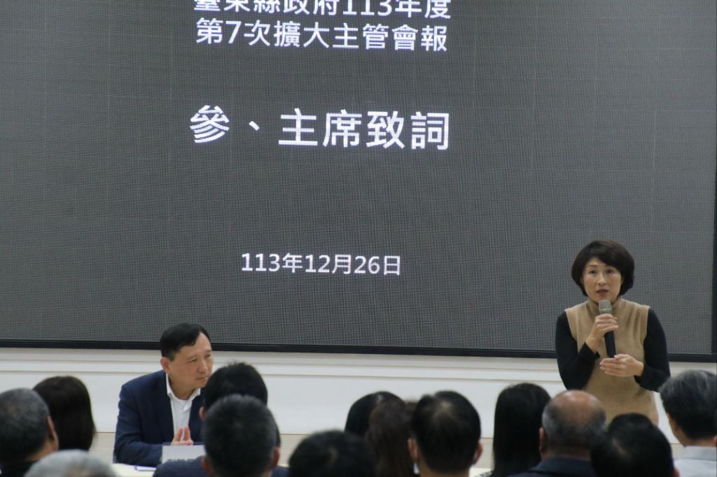 臺東縣政府今(26)日召開今年度最後一次的擴大主管會議暨縣務會議,縣長饒慶鈴特別感謝縣府團隊過去6年的努力,以及議會與所有鄉親對各項縣府施政的肯定、信心及支持,縣府今年獲獎無數,可以說是臺東豐收年,也希望同仁要整理手邊計畫、落實年度預算的執行,爭取更多經費,行政更有效率,讓縣民能夠感受到縣府的努力,覺得住在臺東這座城市非常驕傲、有幸福感。