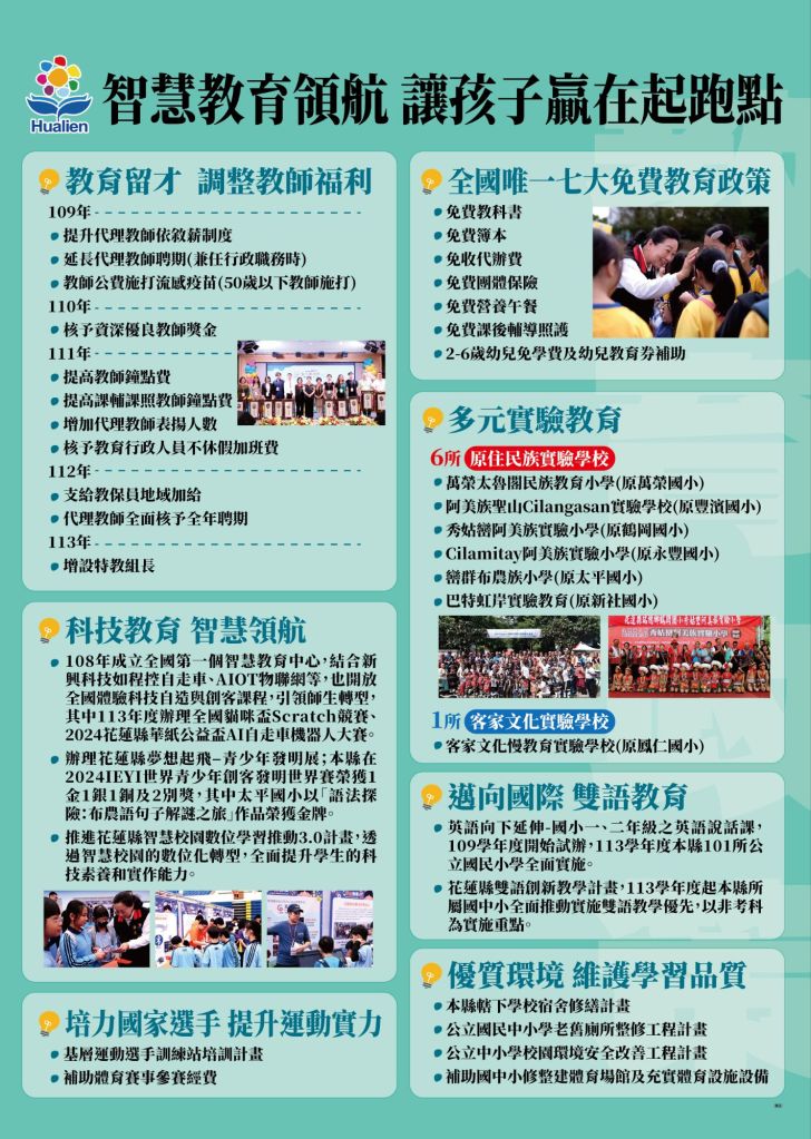 花蓮縣政府秉持「以孩子為中心」的理念,致力打造全縣學生皆能受惠的優質教育環境,縣長徐榛蔚帶領團隊積極推動多項教育政策,從基礎設施到多元課程,全面提升學子學習環境與教育品質,為縣內學子鋪設未來的成功道路。