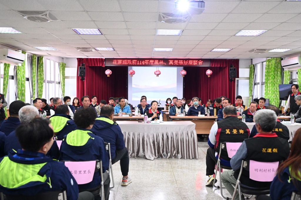 上午首先登場鳳林鎮與萬榮鄉之座談會,下午則是壽豐鄉座談會,現場也有反詐宣導、衛生安全健康等政策宣傳,徐縣長甫入會場一一向各村里鄰長致意問候,村里長發言踴躍,聚焦於候車亭改建、柏油路面重鋪、排水溝拓寬、排水設施、農路改善、通行便橋修繕等改善工程。