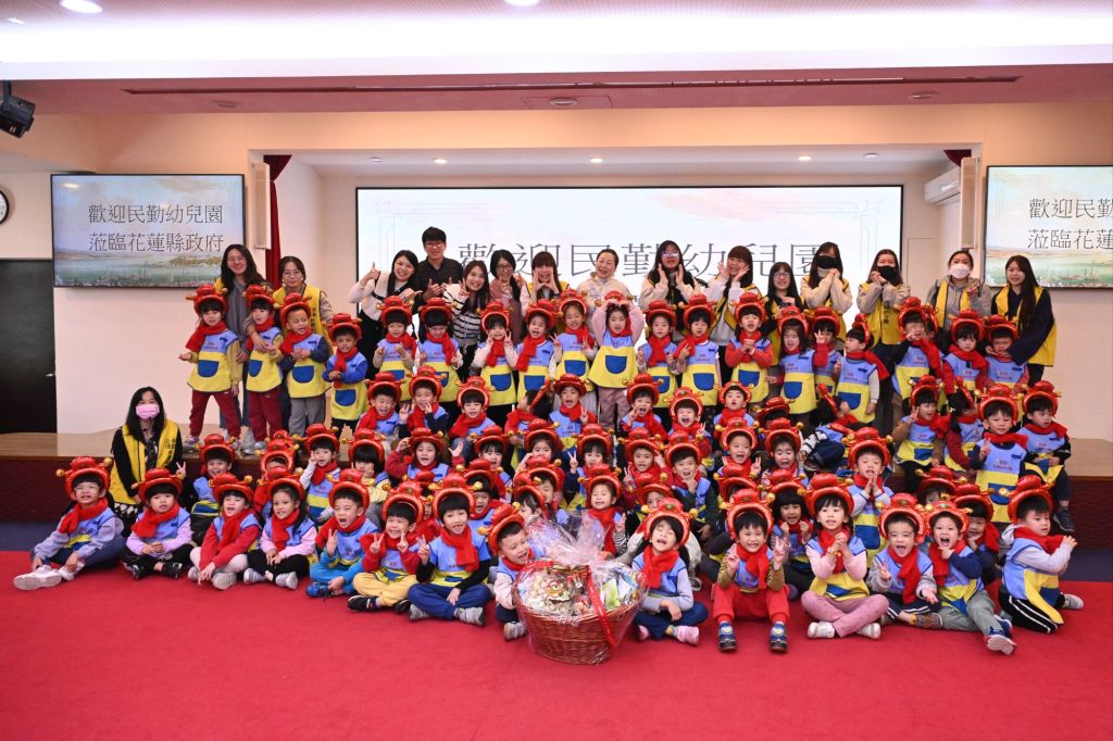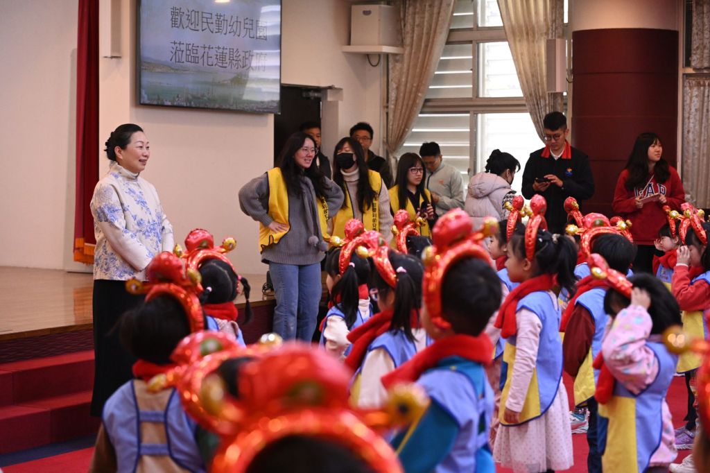 花蓮縣民勤非營利幼兒園今(16)日前往花蓮縣政府拜年,為縣府增添濃濃年節氣氛,縣長徐榛蔚親自迎接熱情活潑的小天使們,除了欣賞學生們精采的唱跳表演外,也親切與孩子們合影留念,場面溫馨熱絡。