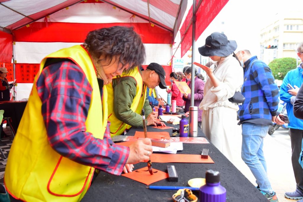 花蓮縣長青書畫會理事長湯大凰帶領會員老師們,在市公所前廣場提筆揮毫吉祥話,更大展身手發揮創意,提筆寫下各種吉祥語組合字,並為市民提字專屬的賀年春聯,活動現場也擺滿一幅幅對聯供民眾自行挑選,儘管寒流來襲,活動一早仍有許多民眾前來,親眼見識書法名家們的揮毫風采。
