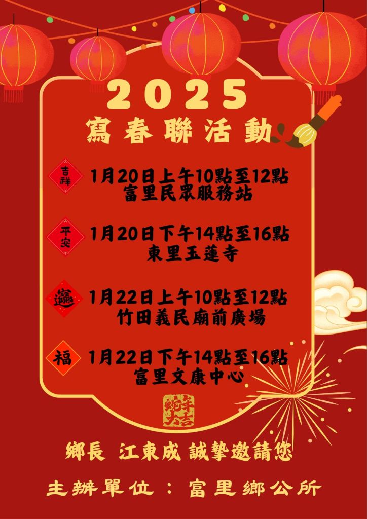 活動時間及地點分別為:1月20日上午10點至12點於富里民眾服務站、同日下午2點至4點於東里玉蓮寺;1月22日上午10點至12點於竹田義民廟埕前廣場、同日下午2點至4點於富里老人文康中心舉辦現場揮毫贈春聯活動,本活動不僅為鄉親們提供一個感受新年氣氛的絕佳機會,還能近距離欣賞書法大師的揮毫技藝,可謂一舉數得。