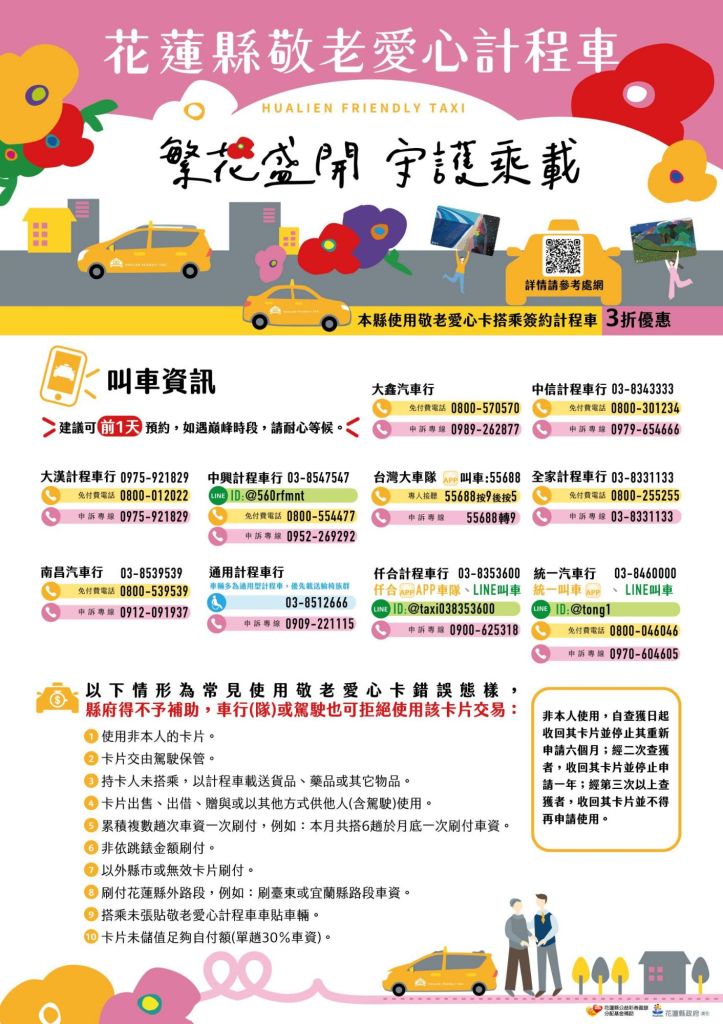 花蓮縣政府敬老愛心計程車隊補助計畫係補助本縣65歲以上長者及身心障礙者,搭乘敬老愛心計程車補助每趟70%車資、每月上限1,000點(元),去(113)年全年度累計受益已達41萬8,356人次、補助車資計新台幣5,284萬餘元,114年新增1家大鑫汽車行加入,目前共計10家計程車行(隊)、663輛車提供服務,但近來有關本縣敬老愛心卡錯誤使用的情形引發關注;為保障服務對象的權益,花蓮縣政府社會處提醒常見10大敬老愛心卡錯誤使用態樣如下,如有錯誤使用的情形,除了須繳還補助金額以外,還可能面臨相關法律責任: