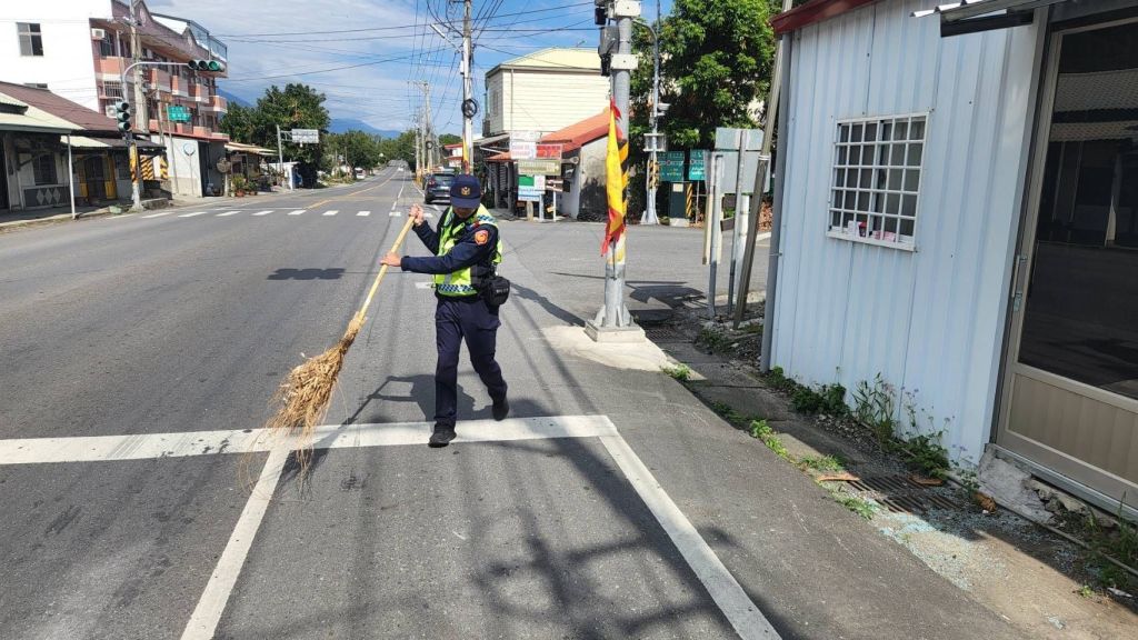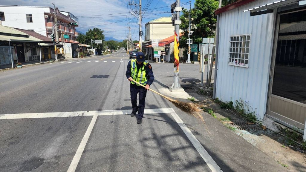 今(9)日上午9時許,臺東縣警察局關山分局瑞豐派出所接獲民眾報案稱「臺9線與新源路路口路面有大量碎玻璃散落,影響行車安全,請派員處理」。警員張君毅獲報後立即趕赴現場,並機警借用附近民宅的竹掃把立即清理,迅速排除危險,確保用路人安全。