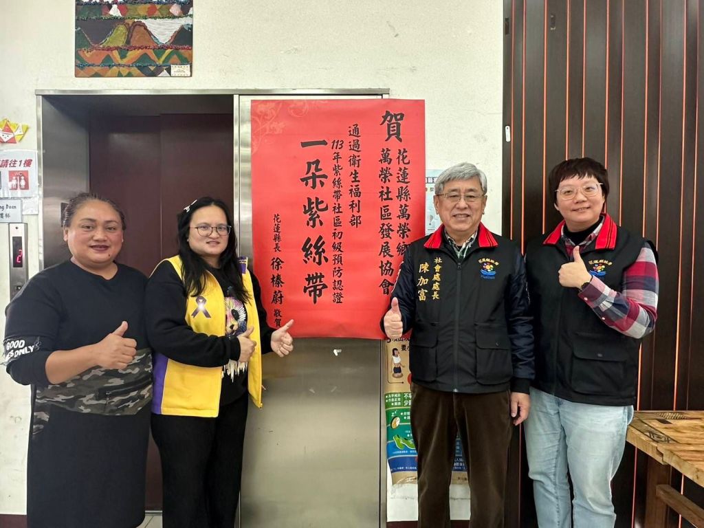 衛生福利部為提升社會大眾推動「零暴力‧零容忍」社區意識扎根及建立正確防暴觀念,爰建立「衛生福利部推動各直轄市、縣(市)紫絲帶社區初級預防認證獎勵計畫」,以分階晉級方式,納入發展防暴社區分級認證指標與認證制度,鼓勵社區自主參與取得各階段認證。衛福部於114年1月20日公布113年紫絲帶社區初級預防認證成績,代表花蓮縣參加認證的吉安鄉南昌社區發展協會、壽豐鄉壽農社區發展協會及萬榮鄉萬榮社區發展協會,皆通過一朵紫絲帶認證,113年薦送3個社區參加認證,各社區均表現亮眼。社會處處長陳加富今日特地前往通過認證社區貼紅榜祝賀,並對社區在推動社區初級預防方面的努力表示肯定,期勉通過認證社區再接再厲,爭取更好的成績。