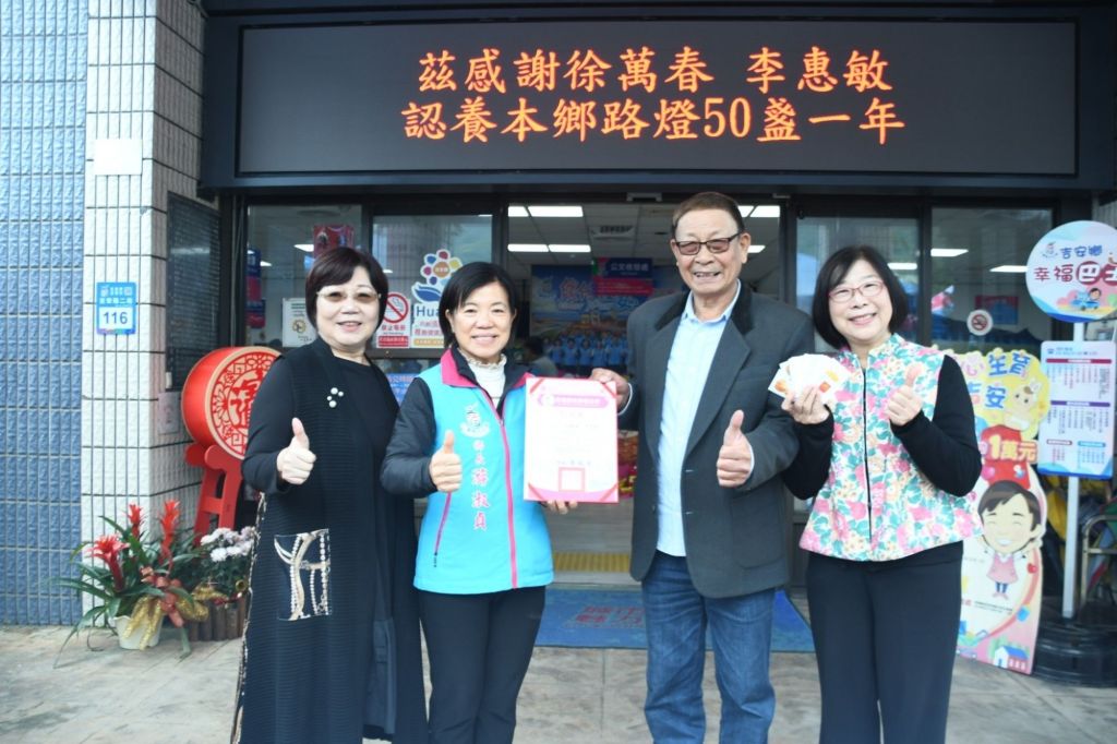 客語薪傳師李惠敏伉儷,為多方守護夜間交通道路安全,在客家合唱團團長張麗如陪同下,捐贈5萬元,認養吉安鄉50盞路燈。此舉延續了他們在玉里鄉捐助100盞路燈的善行,讓南北平安路都能沐浴在安全溫暖的家鄉。鄉長游淑貞親自回贈感謝狀,感謝過去對客家文化薪傳致力的徐會長伉儷和團隊,這次認養不僅提升夜間安全,也象徵著客家文化的傳承與關懷,更展現社會各界對吉安發展的支持。