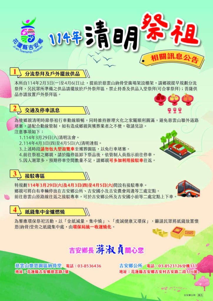 每年清明節期間,慈雲山懷恩園區湧入大量祭祀人潮,為紓解交通壅塞問題,吉安鄉公所於3月29日(六)、4月3日(四)至5日(六)安排接駁車服務,方便家屬安心前往法會現場。接駁車行駛時間:去程(吉安鄉公所→法會會場):上午8時至12時,每30分鐘一班(每班可搭乘17-20人);回程(慈雲山火化場涼亭→吉安鄉公所):上午8時至12時,每30分鐘一班(每班可搭乘17-20人)。如欲自行上山祭拜,請遵守現場人員指揮,車輛請靠右單邊停車,並建議使用小型車輛共乘,以維持道路順暢。