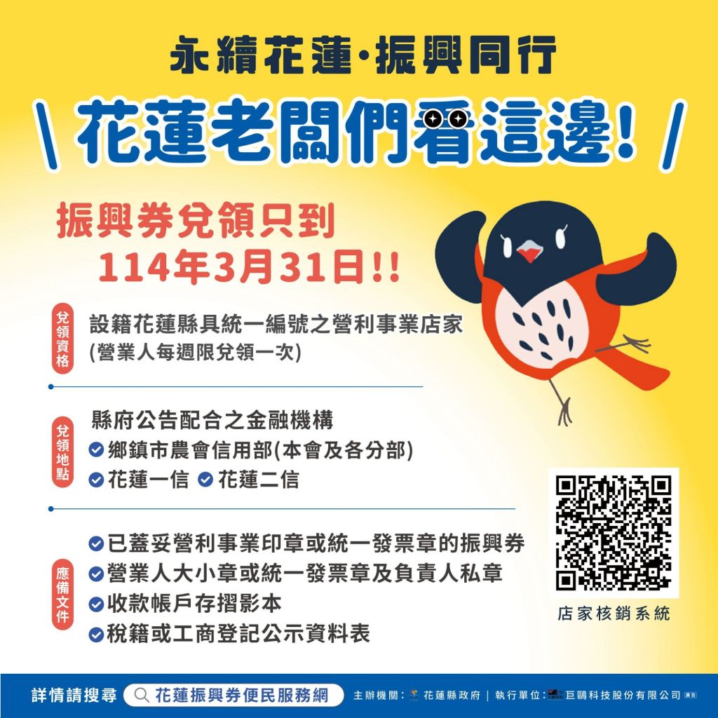 隨著政策推行進入尾聲,縣長徐榛蔚特別提醒所有參與活動的店家,振興券的核銷兌付作業將於114年3月31日截止,請老闆們務必主動確認手中尚未核銷的振興券,並盡快辦理兌付,避免因逾期而喪失權益。符合兌領資格的店家可攜帶振興券至指定金融機構進行核銷兌領,並依核銷流程辦理款項入帳作業。