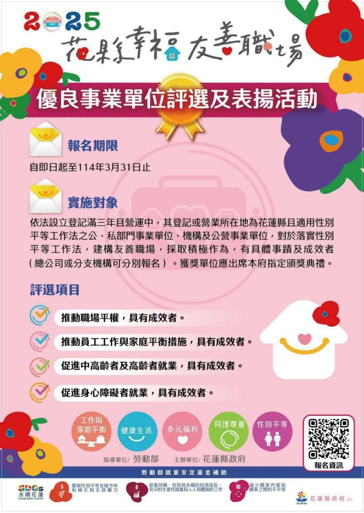 友善職場評選活動報名自114年3月1日至3月31日止,相關資訊可至花蓮縣政府社會處網站查詢,花蓮縣政府期待透過這一活動,能夠推動更多事業單位關注員工的工作與生活品質,營造更加友善、幸福的工作環境,為花蓮縣的發展注入更多正能量。