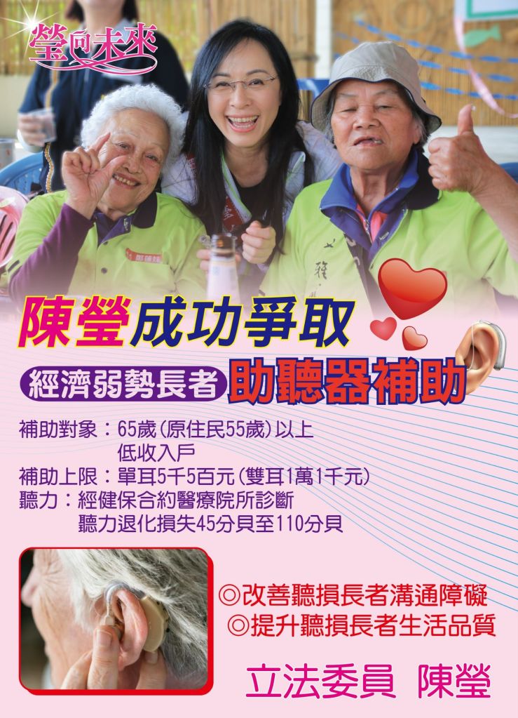 陳瑩二年前在立法院質詢提出要求,經過多次的協調溝通,衛福部於本月公布「低收入戶老人配戴助聽器」的補助辦法,長者年滿65歲(原住民55歲),聽力退化損失45分貝至110分貝,單耳助聽器補助上限5千5百元(雙耳1萬1千元),目前衛福部正與各地方政府社會局處規劃受理申請的程序與窗口。(近期將公布申請窗口)