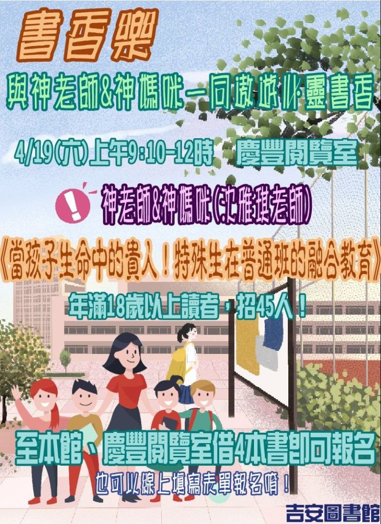 吉安鄉為推廣親子共讀風氣與正向教育理念,由鄉長游淑貞攜手鄉立圖書館精心策劃親職講座「書香樂~與神老師&神媽咪一同遨遊心靈書香」,活動將於4月19日(星期六)上午9時10分至12時,安排慶豐閱覽室溫馨登場,誠摯邀請本鄉家長帶著家中寶貝們,共享四月書香創意心靈饗宴之旅!