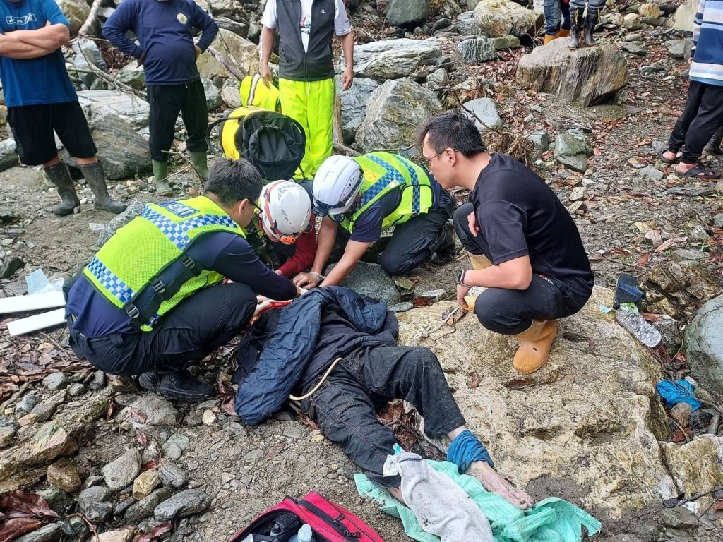 上午10時許,搜救人員行經一處因風災受損的產業道路時,突然聽見山谷下傳來微弱呼救聲,立刻下車搜尋,終於在約15至20公尺高的斷崖底部發現倒臥於乾涸河道中的林姓男子,其手腳無法動彈但意識清楚。現場立即通報119救護支援,消防人員與村民迅速集結,由村長田文才帶領8名村民攜手協助,歷經半小時合力以人力接駁方式將林男移出險地,並交由救護車緊急送往醫院救治。