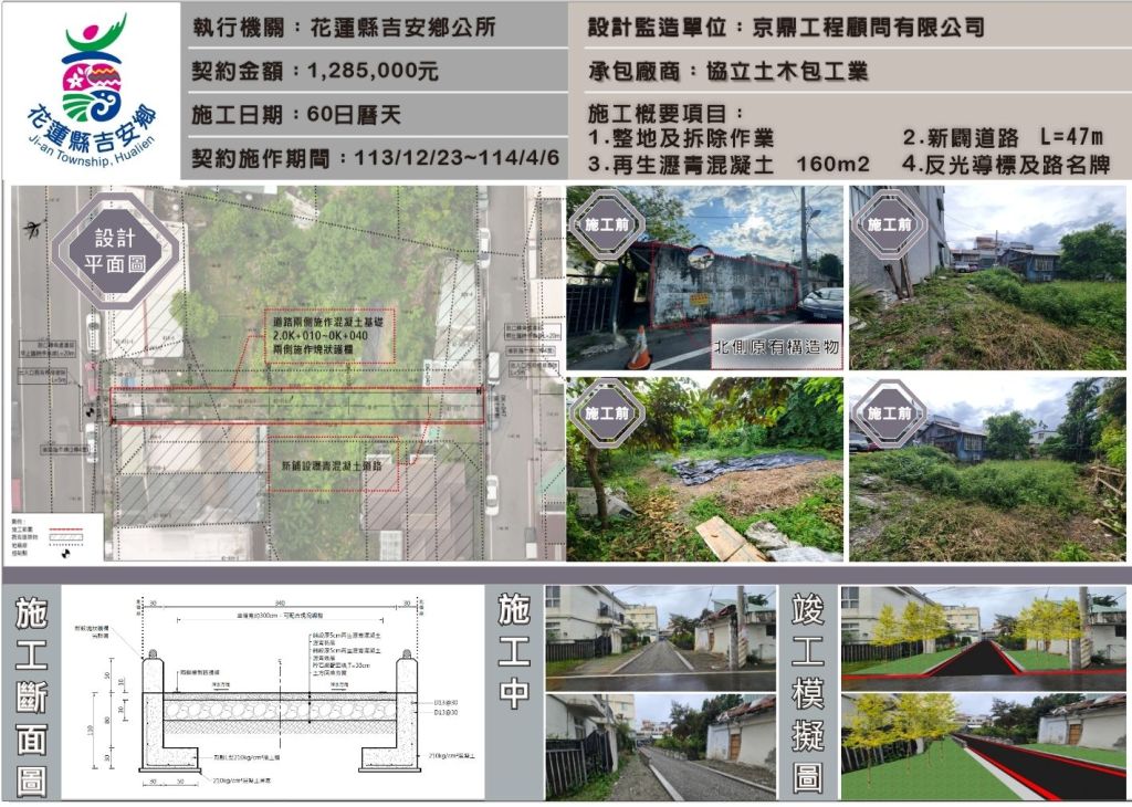 吉安鄉長游淑貞長期重視燈亮、路平、水溝通等基礎建設,以提升鄉親生活品質和重要交通建設。於去年113年底通過鄉代會支持,編列南昌村新闢道路改善工程計劃自籌經費157萬餘元,進行「宜安段814、815、815-1地號土地計畫道路新闢工程」作業。游淑貞也在4月8日親前往工地會勘,由建設課長與施工廠商陪同,鄉民代表林志忠、余震華、詹益萬、南昌村長陳振興,共同出席關心施工進度、工程品質等。