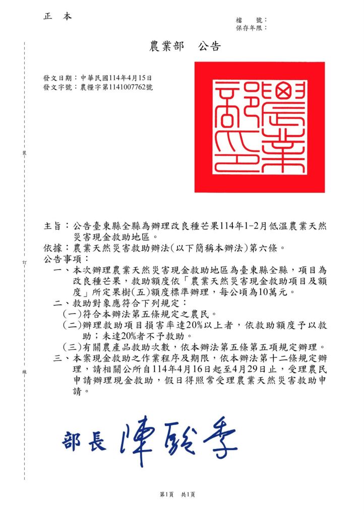 農業部依照「農業天然災害現金救助項目及額度」公告改良種芒果低溫農業天然災害現金救助,每公頃為10萬元,數百位果農受惠。請受災損的果農盡快向各公所提出申請。