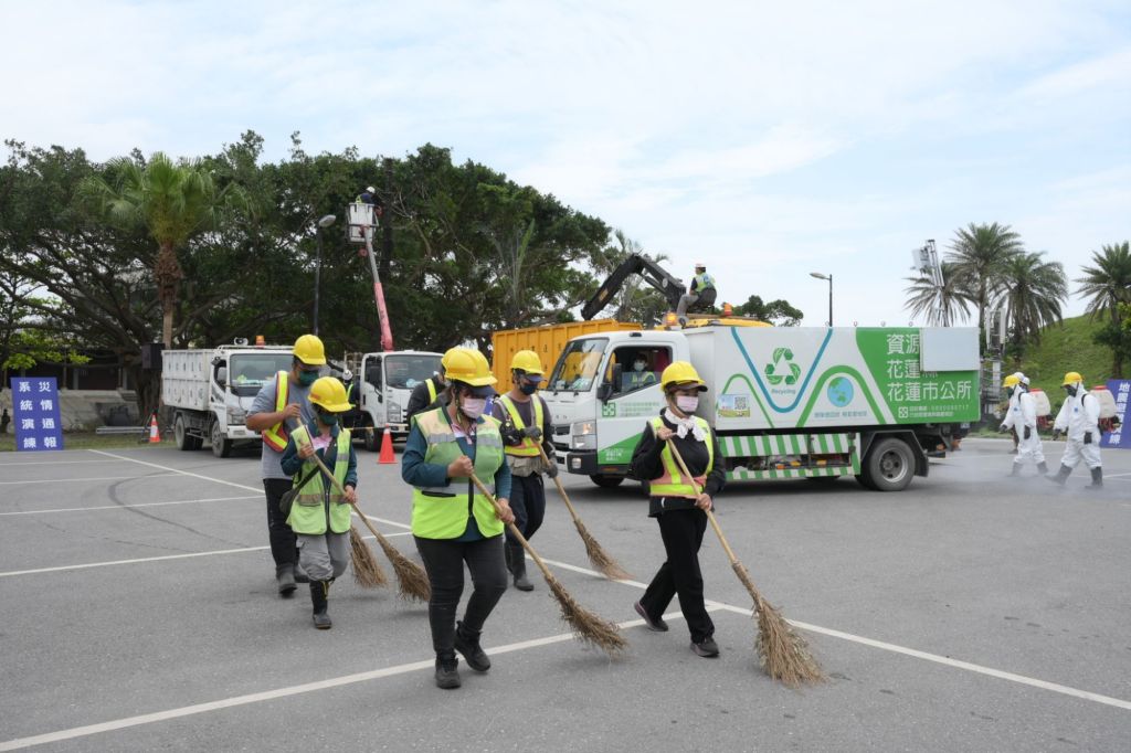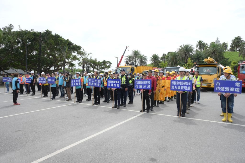 花蓮市公所工程隊、建設課、農觀課、清潔隊、民政課、社勞課及市立幼兒園等單位全員動員,展現公所團隊通力合作的執行力,同時還有各協力單位的大力支持,包括國聯、民生、國光、計工等社區防災小組,花蓮縣後備指揮部、衛生所、警察局、消防局,以及台電、自來水公司與中華電信等單位,共同投入防災整備與災後復原模擬。