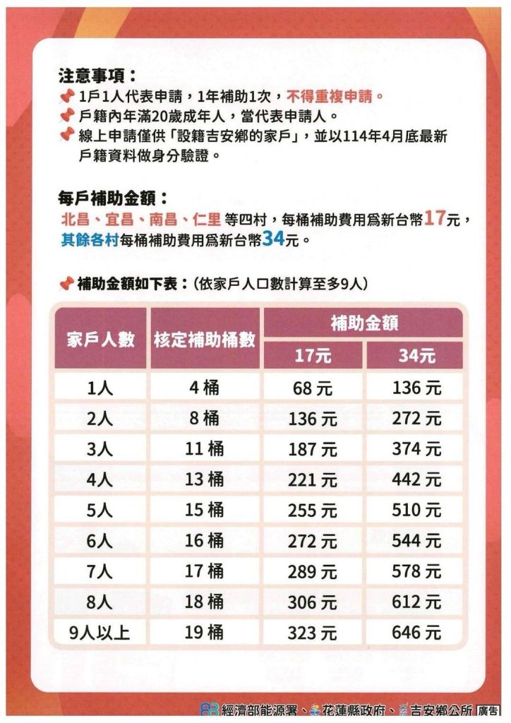 經濟部能源署為考量偏遠與原住民族地區因距離遙遠、交通不便且桶裝瓦斯市場規模較小,導致運載成本提高,致零售價格高於一般地區,特以家戶人數核定補助桶數。今年吉安鄉北昌村、宜昌村、南昌村及仁里村之家戶每桶補助費用為17元,其餘各村每桶補助價格為34元,一家戶人口數計算置多9人、最高可獲補助646元,盼能實際減輕民眾家戶瓦斯費用增額負擔。