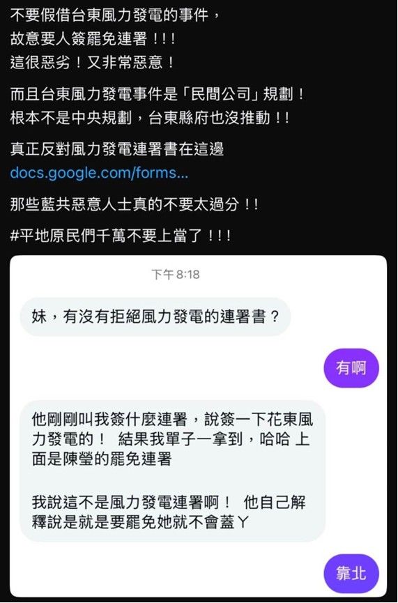 反對東成風力發電的連署,是展現地方民意的方式,各界都會認同與支持,但卻有不肖的立委團隊,在桃園邀請原住民連署「反對東成風力發電」,可是最後拿給族人簽名的,卻是「罷免陳瑩連署書」,當下竟然還說「罷免陳瑩,風力發電就不會蓋」,用這樣的話術欺騙原住民,這個行為已經違反選罷法第98條第1項第2款,運用非法方法取得連署。