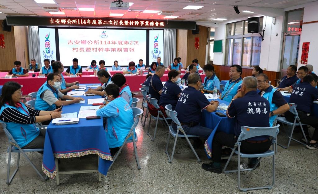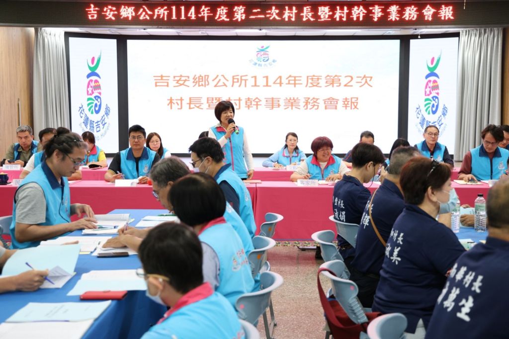 吉安鄉公所積極深化基層服務施政建設,定期每季召開基層服務會議,傾聽村鄰長與鄉親們多元建設意見。於日前鄉長游淑貞再次帶領公所團隊召開「114年度第二次村長暨村幹事業務會報」,共同開啟基礎建設與社會服務共識。會中除了說明前次業務會報中各項提案執行進度,以及各村現次提案36件,以完善鄉親對各項基礎建設鋪陳的需求,同時針對現階段鄉政執行成果及所面臨的瓶頸進行研議討論,鞏固公所、村長、鄰長和村幹事們的團結服務網,讓鄉政建設推展更貼近民意需求。