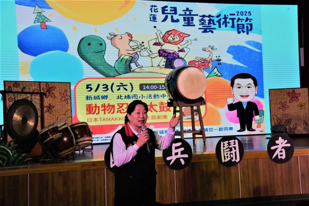 由花蓮縣政府指導、花蓮縣文化局主辦的「2025兒童藝術節」,特別邀請來自日本的TAMAKKO-ZA和太鼓劇團,今(3)日在新城鄉北埔國小活動中心演出,專為親子打造的原創作品《動物忍者太鼓》。縣長徐榛蔚也到場與民眾同樂,一起感受節奏與肢體藝術交織出的震撼魅力。