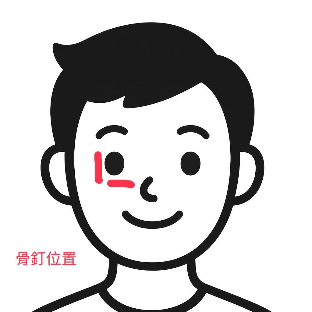 3.頭骨右眼處曾施行顴骨開放性手術,眼眶顯見骨釘固定痕跡。