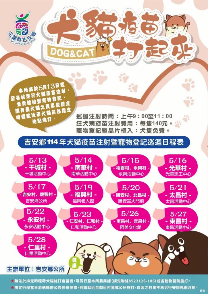 吉安鄉公所「114年度犬貓疫苗注射暨寵物登記巡迴日程」如下:5月13日干城活動中心、14日南華活動中心、15日永興活動中心、16日光華志工中心、17日吉安鄉公所、19日福興老人館、20日勝安宮大門前、21日太昌活動中心、22日永安活動中心、23日仁和活動中心、26日阿美族文化館、27日東昌活動中心、28日仁里活動中心。敬請鄉親依據所在地就近參與,為毛寶貝的健康珍愛護航!