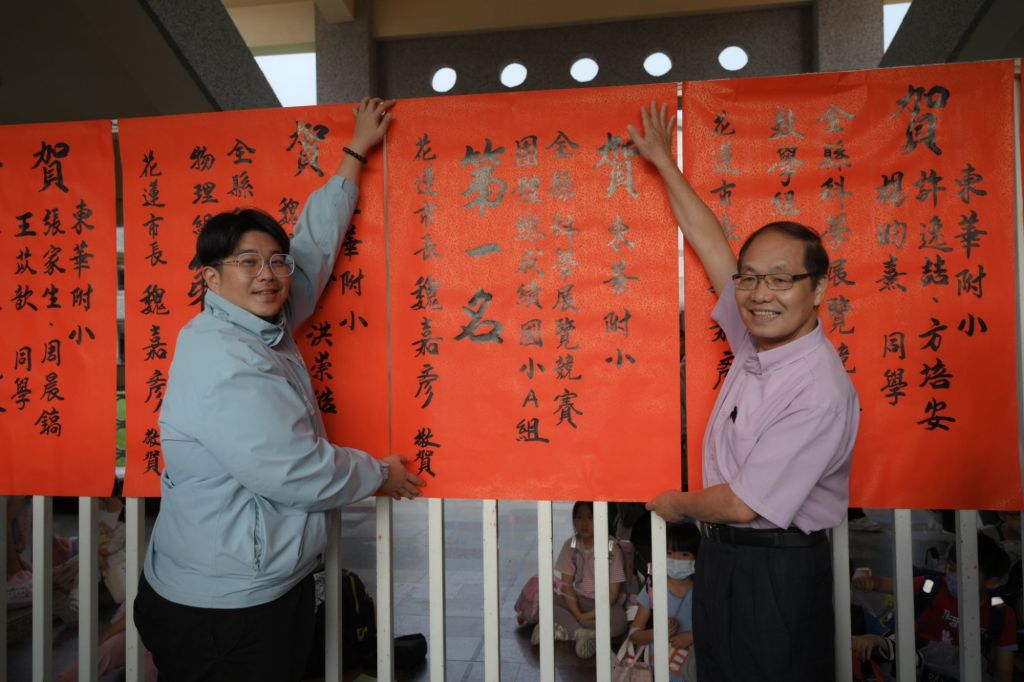 國立東華大學附設實驗國民小學日前參加花蓮縣科學展覽競賽,四件參賽作品表現亮眼,榮獲三項第一名、一項第二名,更以卓越整體成績奪下團體總成績國小A組第一名。市長魏嘉彥昨12日下午親赴校內貼紅榜,向得獎學生與師長表達祝賀之意,並特別設宴犒賞參賽團隊,勉勵大家持續在科學探索上深耕前行。