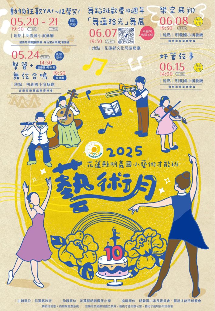 為展現藝術才能班一整年的學習成果,花蓮縣政府與明義國民小學攜手合作,於114年5至6月期間舉辦一系列藝術月活動,分別於明義國小演藝廳與花蓮縣文化局演藝廳舉行國樂、音樂、舞蹈等六場展演。不僅融合多元藝術形式,更邀請縣民共同見證孩子們在舞台上的成長與蛻變,依不同場次透過劃位票券、售票或自由入場的方式開放民眾參與,共同支持本縣藝術教育發展。