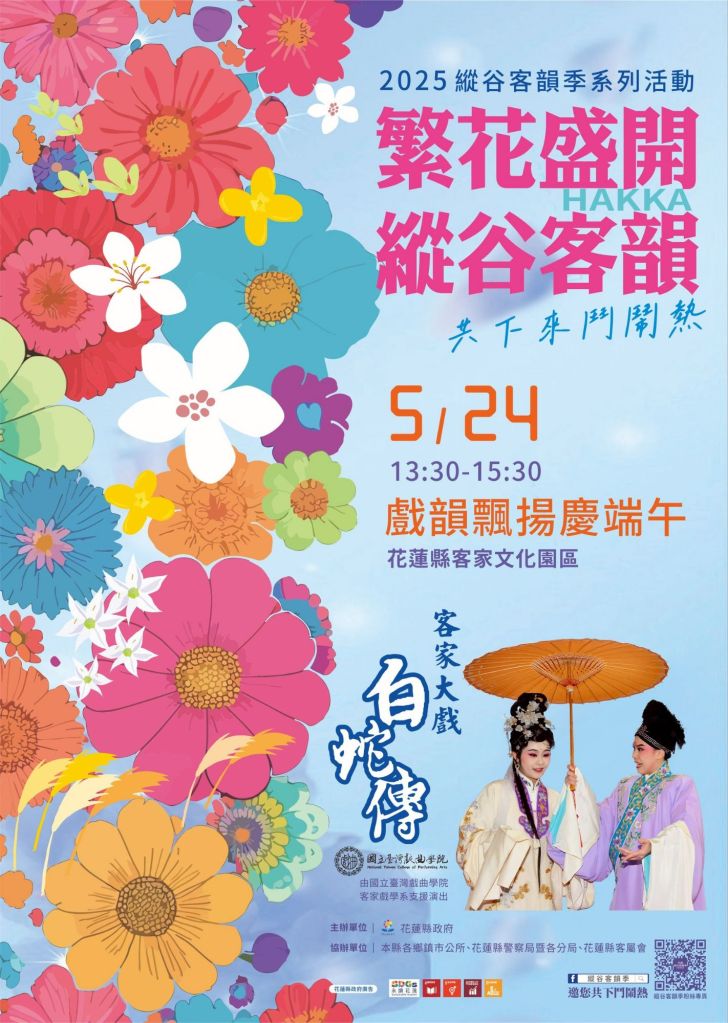 花蓮縣政府主辦「2025花蓮縱谷客韻季」的首場活動「戲韻飄揚慶端午」即將於5月24日(星期六),在花蓮縣客家文化園區盛大展開,本次活動特別安排經典客家大戲《白蛇傳》演出,結合端午節慶氛圍,展現客家戲曲的獨特魅力。