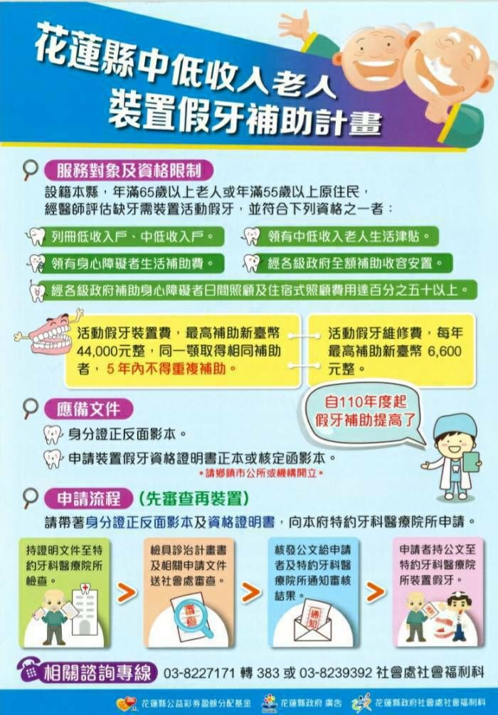 民眾收到核定通知後,應於三個月內完成假牙裝置,並由醫療院所提供裝置成果文件向縣府請款。請符合資格的民眾及早申請,有疑問可洽詢合約牙醫診所或撥打縣府社會處社會福利科(03-8227171轉382)或至花蓮縣政府社會處網站(網址:https://reurl.cc/lz20OY )查閱了解更多資訊。