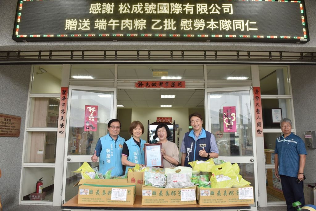 松成號國際有限公司為感謝清潔隊員的辛勞,今29日由董事長廖美燕代表贈送200顆肉粽給花蓮市清潔隊,花蓮市公所主任秘書翁美華代表魏嘉彥市長,與清潔隊長吳慶展一起接受這份愛心,並在議員魏嘉賢的見證下頒發感謝狀,感謝松成號長期熱心公益,以及對清潔隊員的關心。